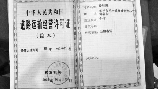 2007年4月,孙启巍在《道路运输证》年审时发现,他的车又被挂靠到了章丘市明众交运有限责任公司。由于这种挂靠模式形式大于实质,他并未太当回事。彼时,他最关心的是自己的出租车营运手续将于2007年12月31日到期,他要赶在到期之前,向章丘市交通局申请办理延期营运手续,以便更新车辆,继续经营。