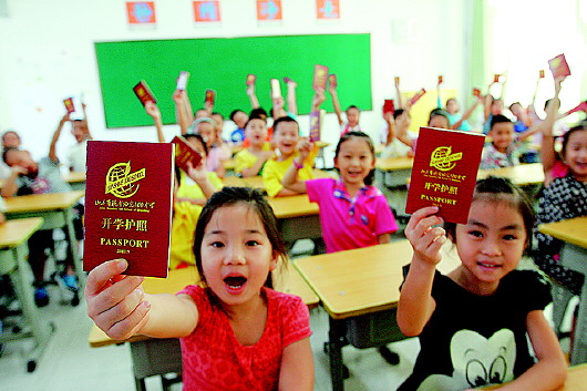 济南阳光100中学的一年级新生展示“开学护照”。(资料片) 本报记者 李飞 摄