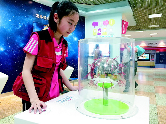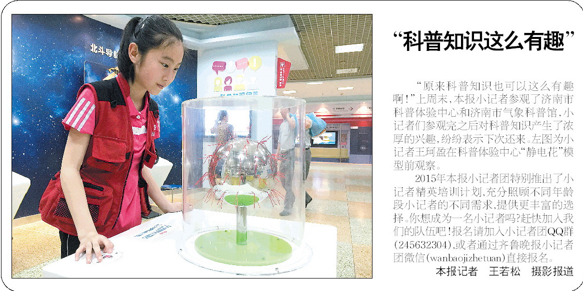 “原来科普知识也可以这么有趣啊!”上周末,本报小记者参观了济南市科普体验中心和济南市气象科普馆,小记者们参观完之后对科普知识产生了浓厚的兴趣,纷纷表示下次还来。左图为小记者王珂盈在科普体验中心“静电花”模型前观察。