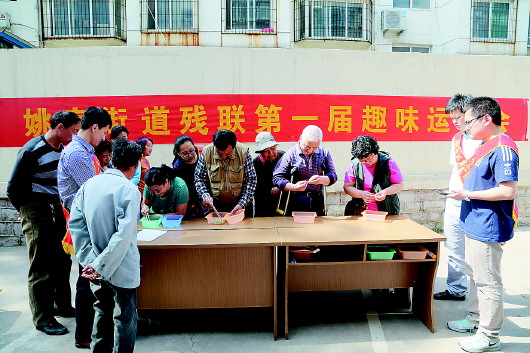 本报讯(记者 肖龙凤 通讯员 杨爱菊) 为迎接第二十五次“全国助残日”的到来,进一步丰富残疾人的文体生活,增强残疾人参与体育锻炼和参与社会的意识,15日上午,姚家办事处残联组织20名残疾人参加街道举办的第一届残疾人趣味运动会,让残疾人在运动中感受快乐,展示自强与自信。社区助残志愿者提供了志愿服务。