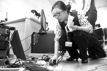 26日,莱山机场值机室内的办公用品已运走不少,工作人员蹲在地上办公。 本报记者 吕奇 摄
