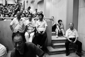 票友们坐在桌子上、马扎上、报纸上听戏。