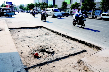 5月25日,在三八路上,一处整修的路面被挖开十余厘米深的缺口,但周围没有任何警示标志,给行人造成安全隐患。 本报记者 马志勇 摄