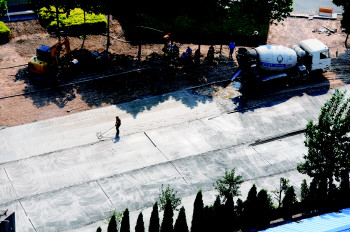 5月25日,德州城区气温达到33℃,在天衢路与湖滨大道路口处的工地上,施工人员在高温下铺路。