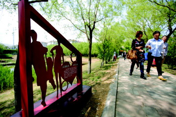 26日,在李沧区湘潭路街道大枣园社区,市民正在参观新启用的岛城首家生育文化园。文化园包括铁艺雕塑、人口文化长廊、生育教育走廊、幸福家庭一条街等。据悉,为了加强对青少年的生殖健康教育,李沧区还在生育文化公园里打造了青少年生殖健康教育中心。