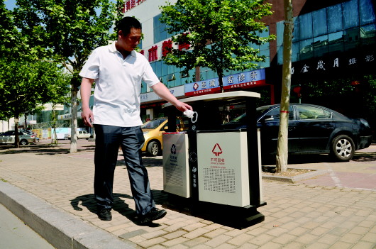 一市民往新型果皮箱投放垃圾。 本报通讯员 李明 摄