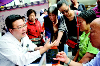 专家给前来义诊的患者讲解一些患病后的治疗方法(资料片)。