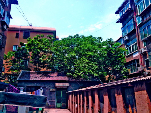 据观察,这个小窄巷位于两个小区之间,树木周围被墙挡着,无法靠近,只能看得到大树生长茂盛的上半部分。