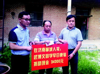 4月8日,阳谷二中高一七班女生武博文被确诊为急性非淋巴细胞白血病,眼下正在北京接受治疗。高额的医疗费让这个原本就很困难的家庭雪上加霜。25日下午,武博文所在学校为其发起捐款活动,在济南工作的聊城人石春莹从朋友圈里看到了这条消息,立马联系了一些在济南工作的聊城老乡,短短20个小时就为其募集了3.43万元善款。27日下午,在济南的聊城老乡会两位爱心人士把这笔钱送到了武博文父亲手中。