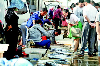 27日,在远遥中心渔港的码头上,不少市民赶在休渔前购买海鲜。据了解,6月1日起,黄渤海将进入伏季休渔期,许多市民都在争先购买这休渔期前最后的鲜鱼。