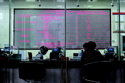 ◥28日,青岛一名市民在银行办理业务,柜台内的大屏幕显示了该行人民币存贷款利率表。