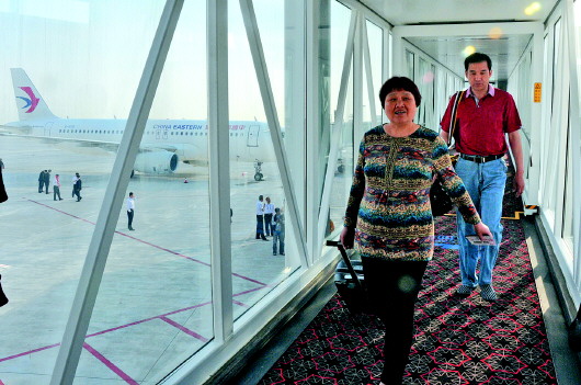28日,烟台蓬莱国际机场首批离港乘客经过廊桥进入机舱。 本报记者 吕奇 摄