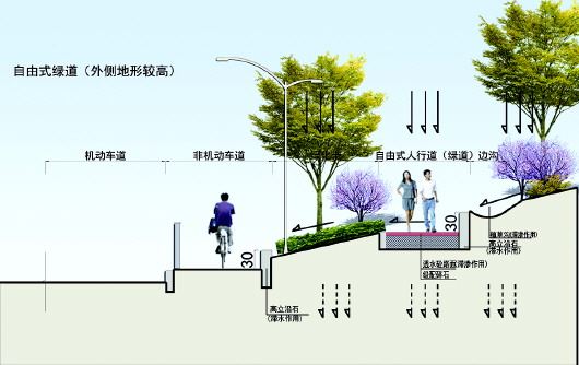 而绿道除了下渗雨水之外,多余的雨水还能顺着与绿道齐平的北侧立沿石,流向下沉15厘米的绿化带。
