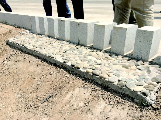 旅游路东段还首次用上了专为济南海绵城市建设定制的新产品——高半米的高个儿立沿石。这些高个儿立沿石分别在绿道南侧和非机动车道南侧,起到滞留和阻挡斜坡雨水的作用。高个儿立沿石比常见的立沿石高了20厘米,其中露出地面的有30厘米。