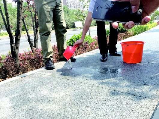 这些绿道透水性能到底有多强?现场工作人员提来了一桶水,用水瓢连浇四瓢,每一瓢水倒到绿道上后,地面没有形成水流,不到5秒钟水就已经全部下渗。不到半分钟,一小片绿道就已经“喝”下了半桶水。
