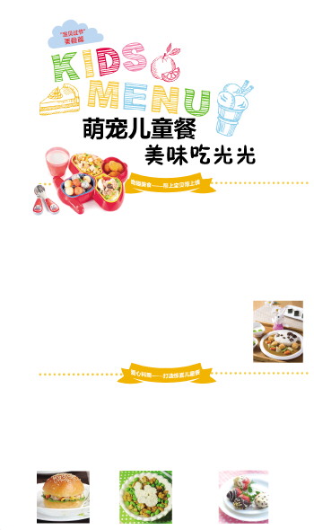 儿童套餐:A、肉酱意面,田园沙拉,风味鸡翅中,香草慕斯;B、番茄海鲜意面,凤尾虾蔬菜沙拉,星月薯饼,黑加仑慕斯;C、番茄牛肉丸意面,甜玉米沙拉,玉米虾,水果沙拉;D、缤纷鸡肉意面,金枪鱼蔬菜沙拉,奶酪薯球,水果沙拉;