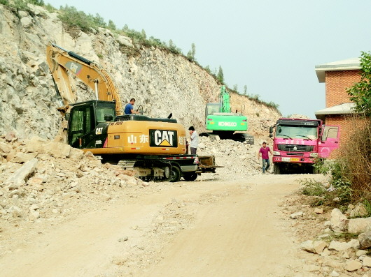 26日下午,记者来到文昌山庄北山坡上的施工现场,工人们正马不停蹄地赶工。现场有两台挖掘机作业,其中一台将挖取的石材装载到卡车上。卡车启动、刹车,挖掘机采石,各种噪音混合在一起,即使隔着数百米也清晰可闻。