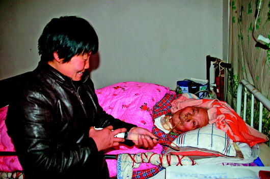 2012年2月,郭翠菊80岁的老公公从集市上回家,刚坐下一会儿,突然身感不适,摔倒在地,昏迷不醒。郭翠菊和丈夫在街坊邻居的帮助下,立即将公公送往市区的大医院。经医生诊断,老人突患脑出血,需住院治疗。此后的两个多月,老人一直没有醒过来。