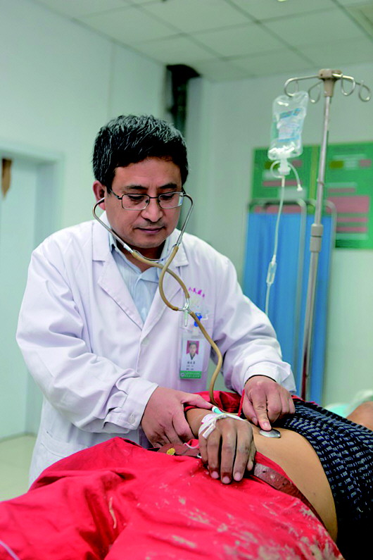 ◤张发勇正在给病人做检查。 通讯员 杜秀香 摄