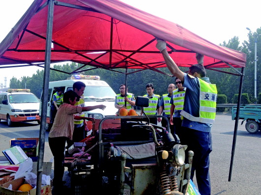 执法人员对国道两侧香瓜摊进行整治。 本报记者 梁越 摄