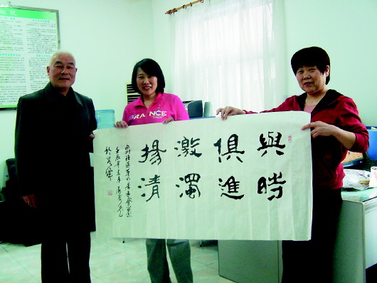 ◤甸柳四居的翟洪涛老人正在展示自己的书法作品。