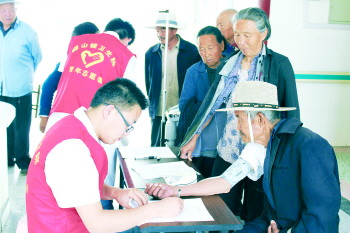 20日起,峄山镇启动65周岁及以上老年人免费健康体检,计划用2个月的时间,对全镇5675名符合条件的老年人进行常规体检,并建立完善电子健康档案。图为峄山镇卫生院青年志愿服务站志愿者为老人测量血压。 本报通讯员 胡雁南 摄