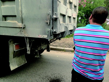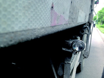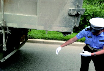 随后,民警又查处了多辆类似自卸货车,发现多数这种车辆的尾部防撞栏都安装不正确。在一辆自卸货车后斗尾部挡板处,记者发现挡板底部有明显撞击、磨损的痕迹。民警说,自卸货车在卸货时,后斗竖起,后斗尾部的挡板底部往往直接撞击地面,就会造成这些痕迹。如果自卸货车尾部安装了防撞栏,后斗就会无法完全竖起,不方便卸货,也就是因为这一点,不少自卸车不愿意正确安装尾部防撞栏。