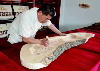日前,一个长1.7米、重30多公斤的子在青岛胶东非物质文化遗产博物馆亮相。这是目前国内最大的手工子,上面雕刻的鲤鱼栩栩如生、纹理清晰,寓意年年有余。图为制作者王丕文正在对子精雕细琢。