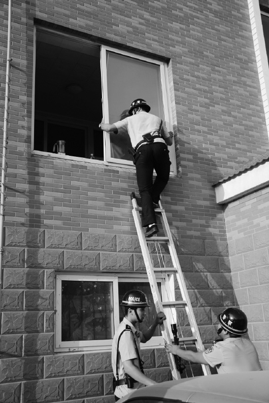 6点26,虽然张某在家但却迟迟不开门,干警们只能爬上梯子,打开厨房的窗口,进入家中。