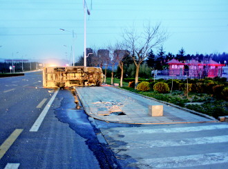 4月16日4时许,经区青岛南路银河汽修附近,一辆青岛牌照的轻型厢式货车侧翻,驾驶室被撞得严重变形,车内三名司乘人员中,驾驶员徐某当场死亡,另两人被甩出车外,不同程度受伤。