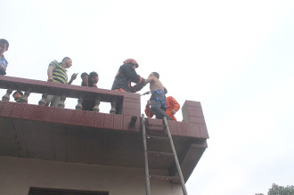 到达现场后,消防队员看到一男子正站在自家楼顶上,嚷嚷着要跳楼,情绪十分激动。经现场村民了解得知:该男子因为喝点酒和邻居发生争吵,一时想不开,就要跳楼。中队指挥员经过和跳楼者20多分钟的交谈,终于将其劝阻,为了保证安全,并用绳索将其吊着缓缓放下。