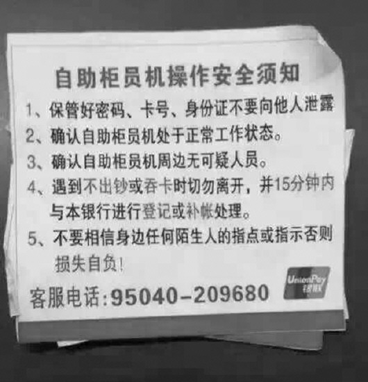 骗子贴在ATM机上的“温馨提示”。 警方供图