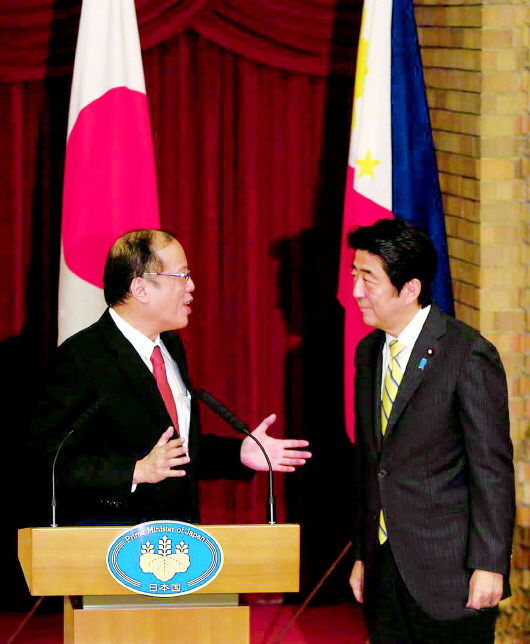 2014年6月24日,阿基诺三世访问日本,与日本首相安倍晋三举行会晤。(资料片)