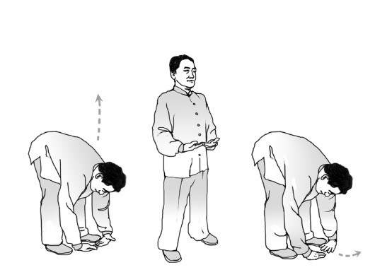 ③霸王作揖:两手掌心下按,如捞月状回至丹田,做三次。