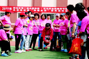 60米托球跑、5米套圈、8米门球射门、夹玻璃球、穿衣接力……1日,在永平路小学,社区居民正在参加运动比赛。当日,李沧区永安路街道举办2015年李沧区第二届公益体彩·区长杯全民健身节暨永安路街道“和谐永安”居民运动会。此次运动会共设13个项目,600多名居民参赛,年龄最大的80多岁。