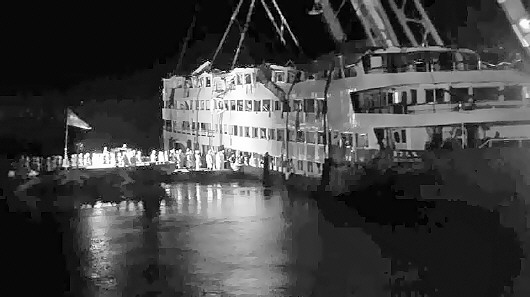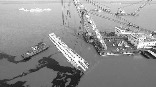 18时许,再次进行起吊作业,3艘起吊船同时作业,船体抬升速度明显加快。18时50分,“东方之星”客船整体打捞出水。