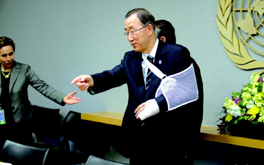 喜欢足球的政要不止莫拉莱斯一人,联合国秘书长潘基文也会时不时地披上战袍上场踢几脚。2012年5月12日,潘基文在与驻联合国的外交官们踢球时摔倒,造成左手骨折,不得不打石膏固定。然而,这并没影响潘基文的公务活动。两天后,打着石膏在联合国总部会见了巴拿马外长恩里格斯。