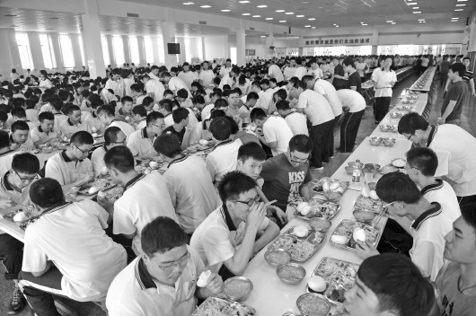 6日,在济南历城二中餐厅内,已经“入驻”的考生正在排队就餐。 本报记者 王媛 摄