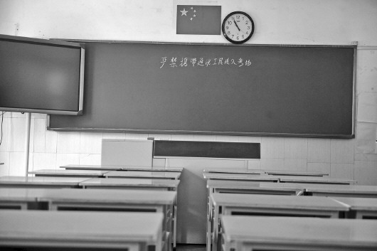 6日,在历城二中一考场内,黑板上写着“严禁携带通讯工具进入考场”。 本报记者 王媛 摄