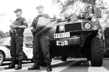 考场外戒备森严,为考生保驾护航。 本报记者 吕奇 摄