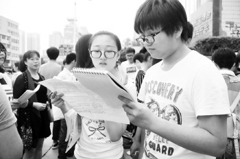 进考场前,考生们拿着复习资料做最后的复习。 本报记者 吕奇 摄