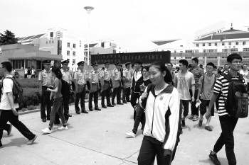 为保障今年的考试秩序,日照边防支队派出7名官兵,手持警用盾牌和橡胶警棍在考场周围进行巡逻。