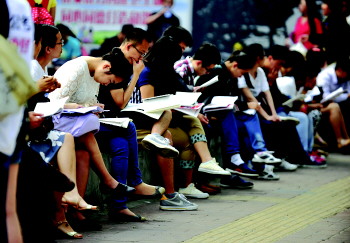 2015省考笔试考场外考生正在复习。 本报记者 王媛 摄