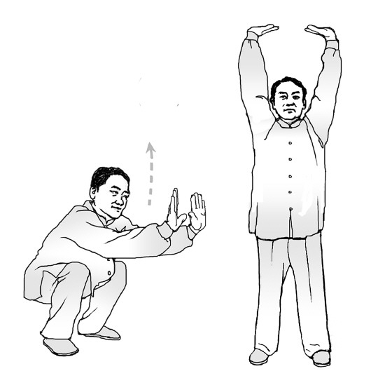◥两手托天:要求两手上翻,手掌托天状。做三次。
