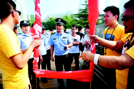 8日,在省实验中学考点,一些年轻人为了宣传某款网络游戏在考点外拉起横条幅,妨碍了考生入场的通道。市中公安分局的民警见状上前制止了他们,还考点外的一份清静。
