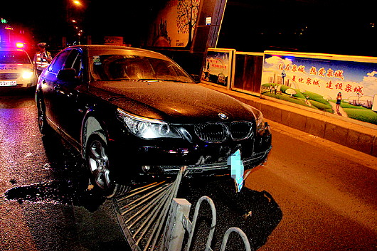 本报96706热线消息(记者 张泰来 实习生 戴杰) 深夜,一辆宝马轿车突然失控冲上了路中央的BRT护栏,而肇事的驾驶员因为喝了酒,还晕乎乎的不知道发生了什么。