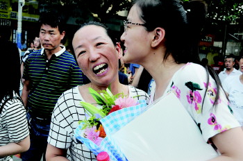 8日下午5:00,2015年夏季高考落下帷幕。在潍坊中学考点门口,考生黄佳璇收到了妈妈送来的鲜花,高兴地给了妈妈一个拥抱,感谢她一直以来辛苦的付出。