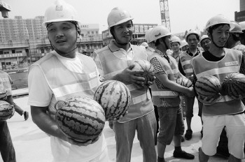 农民工领到了消暑降温的西瓜。本报记者 孙国祥 摄