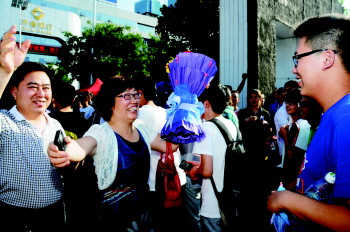 6月8日下午高考结束。在德州一中考点,一位家长手持鲜花拥抱走出考场的孩子。