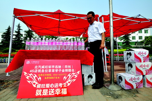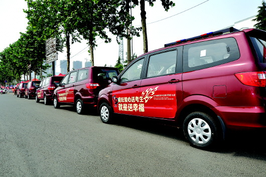北汽威旺邹平迅驰(同创)4S店为了服务好高考生,特意抽调5辆红色北汽威旺M20(贴有宣传车贴)组成爱心送考车队,供学生和家长免费试用,考试之前将学生从家安全送到考场,等待学生考完试将学生安全从考场送回家。考试期间公司还在考场附近设置爱心站点,有专门的工作人员负责免费给考生和家长提供北汽威旺爱心矿泉水和座位,给考生提供文具袋,铅笔,橡皮等文具!
